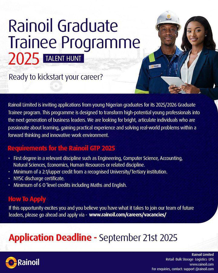 Are you a young graduate looking to start your career with one of Nigeria’s leading oil and gas companies? Rainoil Limited is inviting applications for its 2025 Graduate Trainee Programme (GTP). This initiative is part of Rainoil’s commitment to developing high-potential Nigerian graduates into the next generation of business leaders.