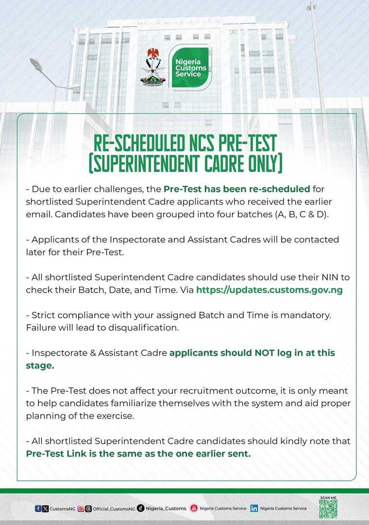 The Nigeria Customs Service (NCS) has officially announced the rescheduling of the Superintendent Cadre Pre-Test due to earlier technical challenges. Shortlisted applicants who received the initial email notification are now required to participate in the pre-test, which has been grouped into four batches (A, B, C, and D).